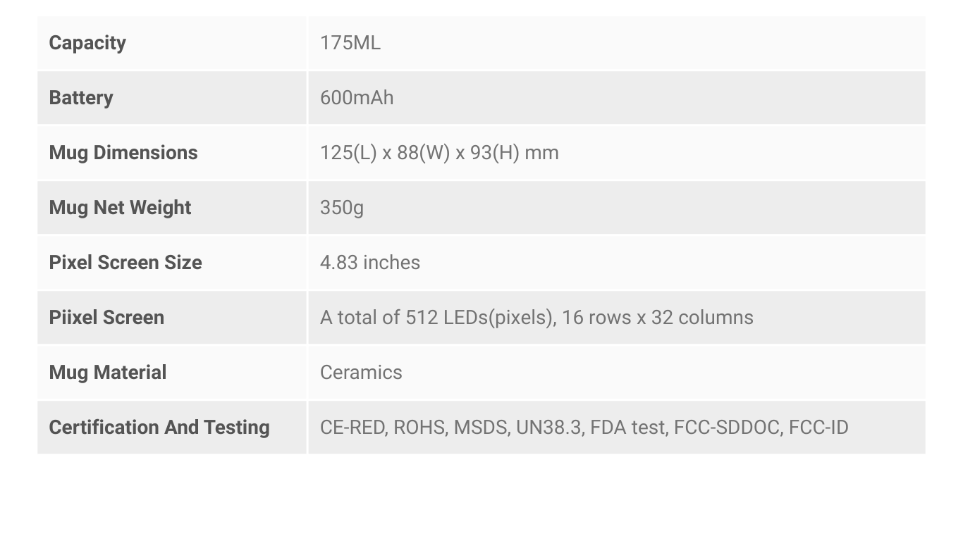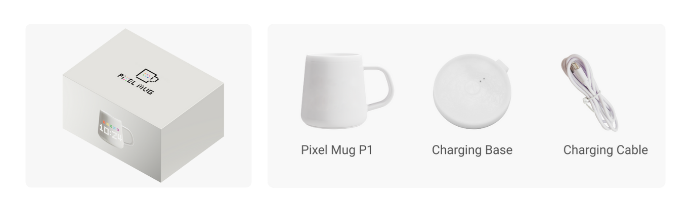 - Contents: PixelMug P1 x1, Charging Base x1, Charging Cable x1.