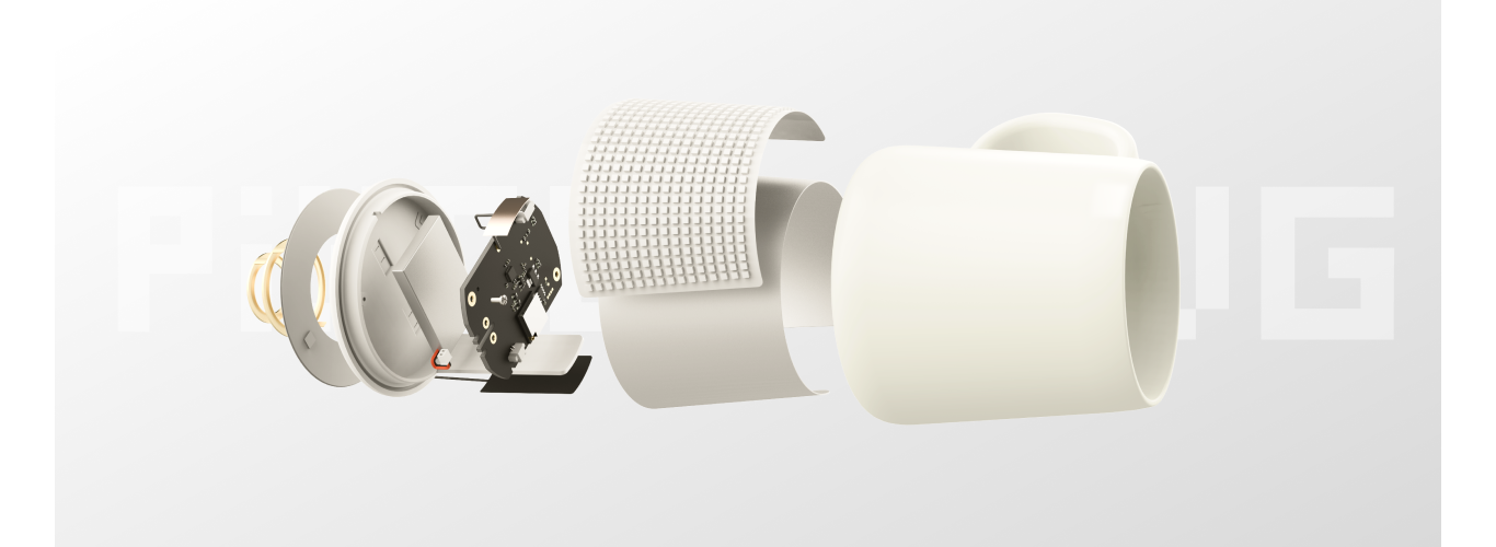 The pixel display and hidden touch zone are seamlessly integrated into the mug